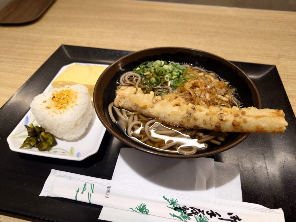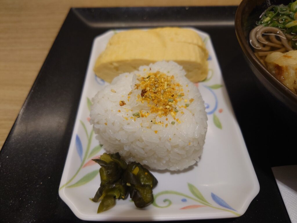 ちくわの天ぷらも巨大で食べ応えあるし、おむすびとだし巻きを一緒に食べたらおなか一杯になりました。おむすびの上のふりかけは受け取りのカウンターに置いてあるやつをかけました。