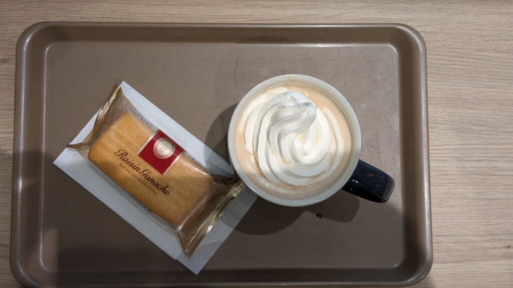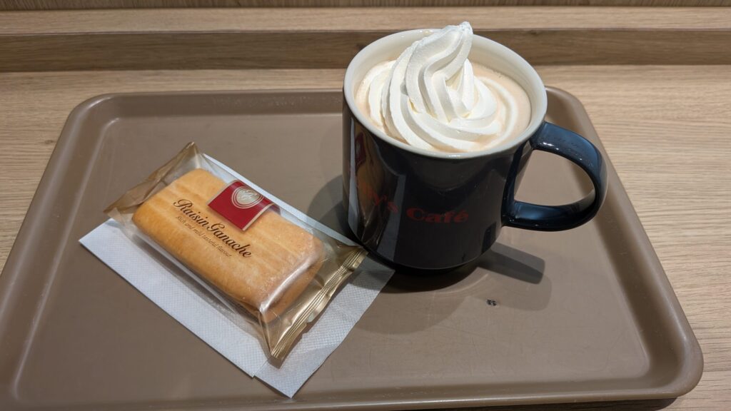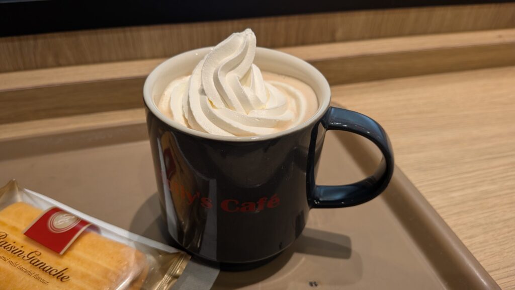 ホリーズカフェのカフェオーレhotにホイップクリームを載せた贅沢な飲み物のホットをいただきました。