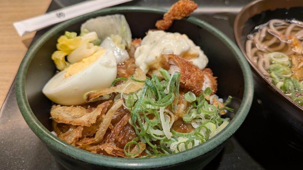 ミンガス独特の玉ねぎの素揚げとネギがタップリ載ったかけそばとゆで卵、チキン南蛮、白菜のピクルス(季節によって白菜が他の野菜に変わるかも)が載ったカレー丼が付いてるので。