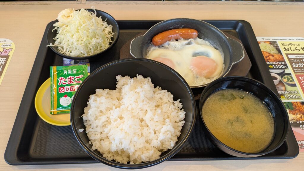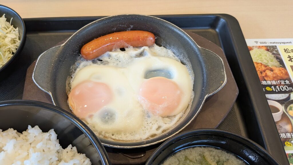 松のやの得朝ソーセージエッグ定食(小鉢無し) 490円です。