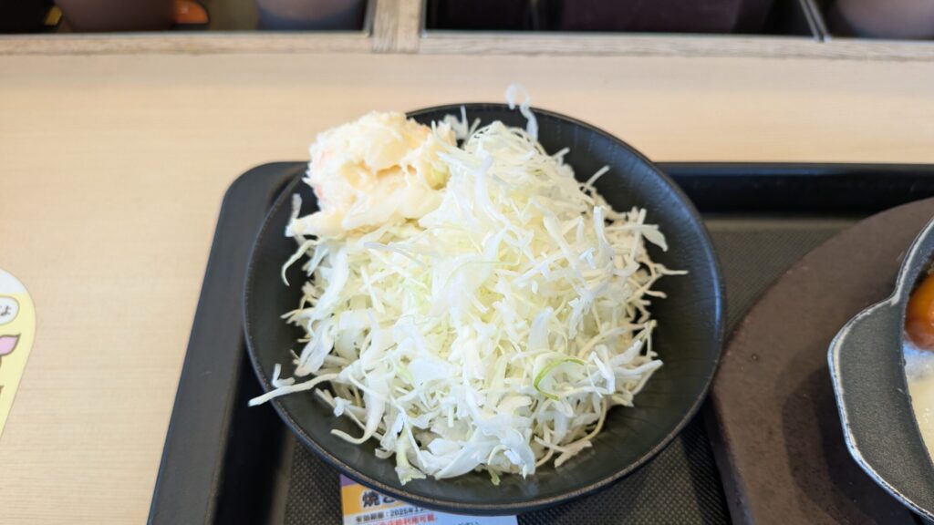 ポテサラ付きの生野菜が付いてるのが好きですね。目玉焼きをご飯に載せて醤油を垂らして食べるのも良いし、目玉焼きだけ食べてご飯を食べるのも良いです!