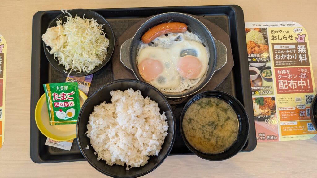 目玉焼きx2,ソーセージx1にポテサラ付きのミニ生野菜、みそ汁、ご飯(大盛無料)、無料クーポンふりかけ(たまご)です。